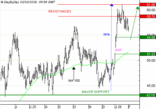 LEONARDO est dans une tendance haussière affirmée à moyen terme. Le rythme a ralenti en 2025, mais un signal de sortie de consolidation a été donné en janvier. Il est interrompu actuellement par une correction, qui ne remet pas en cause la tendance de fonds. Le repli devrait être suivi d'une reprise de la tendance de fonds vers les précédents sommets. Le retracement de 38 % de Fibonacci depuis le creux de l'hiver est une opportunité pour relancer le mouvement haussier. Nous visons un retour au plus haut à 61 euros, avec une cible intermédiaire à 58,7 euros. La rupture du support majeur à 43,15 invaliderait cette tendance haussière.