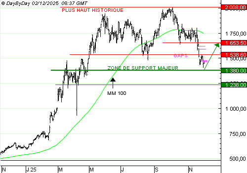 RHEINMETALL corrige une hausse phénoménale depuis le mois de mai. Depuis le sommet à 2008 euros début octobre, le titre est passé par deux phases de baisse, entrecoupée d’un plat. Cela constitue une correction complète. Le creux atteint hier n’est pas très éloigné du retracement de 38 % de la hausse depuis novembre 2024, un niveau clé dans le maintien de la dynamique haussière de moyen terme. Nous envisageons une reprise, à tout le moins pour aller combler les deux récents gaps et jusqu’à la résistance à 1653,5 euros. La rupture du support majeur à 1380 EUR invaliderait cette tendance.