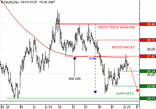 PFIZER INC. a déclenché une vive impulsion baissière depuis la résistance majeure à 29,96 USD. Après avoir approché le support à 24,11 USD, une reprise haussière s'est développée jusqu'à la résistance à 27,42 USD. Cet obstacle est renforcé par la moyenne mobile à 200 jours et le ratio de 50 % de Fibonacci : la tendance baissière devrait reprendre et renvoyer les cours sur le précédent plus bas à 24,11 USD, avec des soutiens intermédiaires à 26,24 USD et 25,06 USD. Une clôture au-dessus de la résistance majeure à 29,96 USD repousserait cette anticipation.