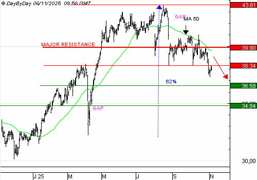 AXA a ralenti son mouvement haussier dès le mois de mai. Le titre a rejoint un dernier sommet en août. Depuis, la moyenne mobile à 50 jours s’est retournée à la baisse, et les cours évoluent sous ce seuil. Cela reflète une tendance court terme qui est devenue baissière. Le rebond des derniers jours bute sur le précédent creux, à 38,34 euros. C’est un niveau idéal pour reprendre le chemin de la baisse. Nous visons le premier support à 36,58 euros, puis potentiellement le second à 34,84 euros. Le franchissement de la résistance à 39,9 euros invaliderait ce développement baissier à court terme.