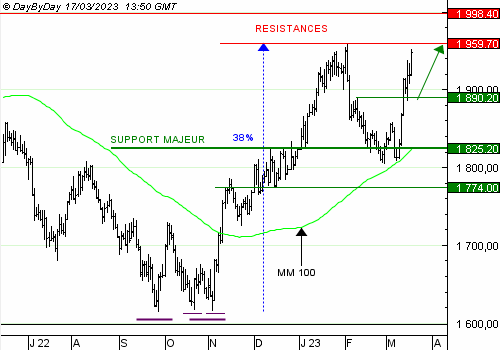 L'Or (Once) a poursuivi son mouvement haussier par un rebond sur l'ancienne résistance devenue support à 1 890,2 USD. Les cours sont maintenant proches de la résistance à 1 959,70 USD, sommet du début d'année. Nous profitons de ce mouvement pour déboucler la position prise sur le Turbo Illimité Best CALL Or (Once) S689T.