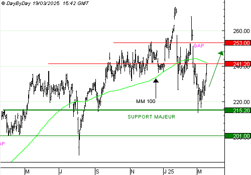 SCHNEIDER ELECTRIC a eu une belle journée qui lui permet de rejoindre notre première résistance à 241,2 euros. Ce seuil peut causer une pause dans le mouvement et nous proposons une prise de profit partielle avant de viser la résistance suivante à 253 euros.