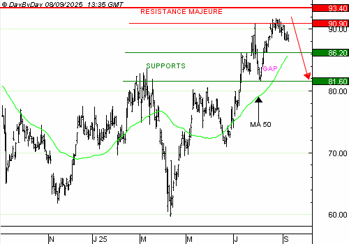 BMW baissote depuis la tentative de franchissement de la résistance à 90,9 euros, sans accélération baissière, ni haussière. Les indices européens évoluent en ordre dispersé depuis quelques mois, avec de grosses surprises fréquentes. Nous pensons qu'il vaut mieux réduire l'exposition au titre, au vu du calme plat.