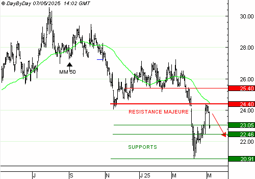 Pfizer a nettement baissé hier après-midi. Notre premier support est atteint. La baisse a été si rapide qu'elle peut demander quelques jours de correction haussière avant de reprendre vers les supports suivants. Nous proposons une prise de profit partiel.