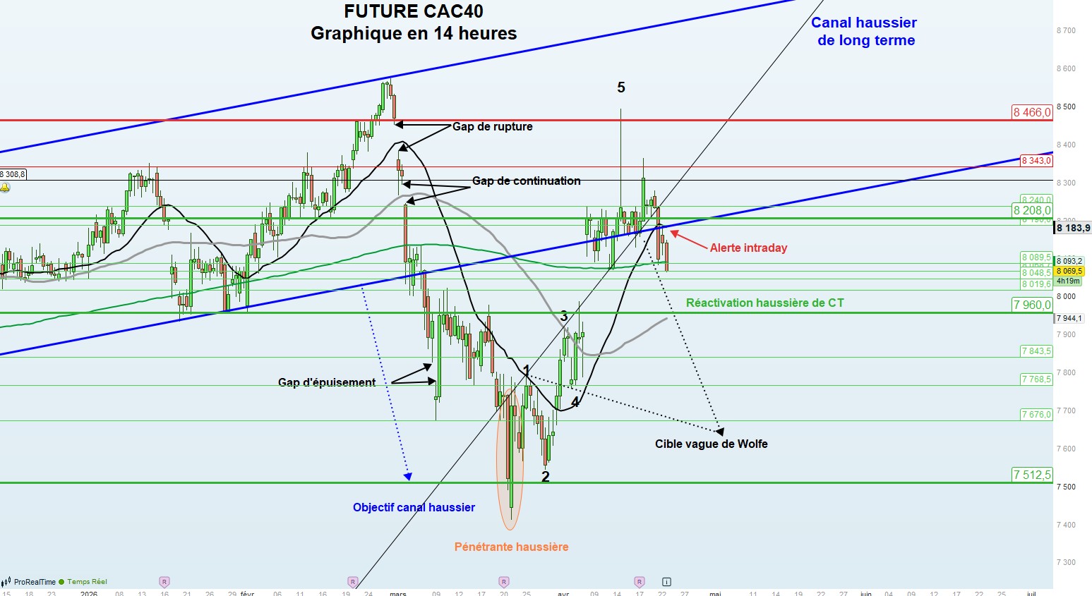 Graphiquement, le Future CAC 40 (cf. graphique en données 14 heures) a finalement validé une structure de retournement en vague de Wolfe par la rupture de l’oblique reliant les points 1 et 3 à 8 235 points. L’indice est par ailleurs repassé sous la borne inférieure du canal haussier de long terme, avant de rebondir, en début de séance, sur le point médian du Marubozu noir. La cassure de la moyenne mobile à 200 périodes, située à 8 090 points, confirmerait l’engagement d’une phase corrective, avec pour première cible le niveau de réactivation haussière de court terme situé à 7 960 points. Tant que ce seuil demeure préservé en clôture, le biais reste orienté à la hausse. En revanche, sa rupture ouvrirait la voie à une extension du mouvement de consolidation en direction de l’objectif théorique de la vague de Wolfe, à 7 630 points. Enfin, la ligne de cou de la configuration en triple sommet, établie à 6 999 points, constituerait, en cas de rupture, le point de départ d’une accélération baissière susceptible d’entraîner une correction supérieure à 1 000 points.