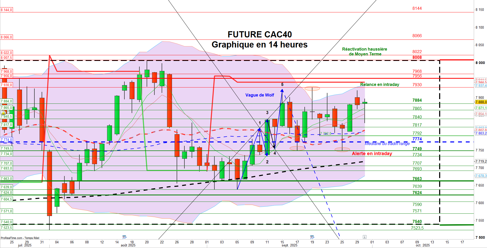 À l’inverse, un repli marqué sous le point bas du jour à 7.828 points fragiliserait la tendance en intraday et raviverait la pression vendeuse. Un tel scénario ouvrirait la voie à un retour vers la partie centrale du trading range (médiane), ce qui confirmerait la reprise en main des vendeurs, surtout si la zone d’alerte située à 7.749 points venait à être enfoncée à son tour.