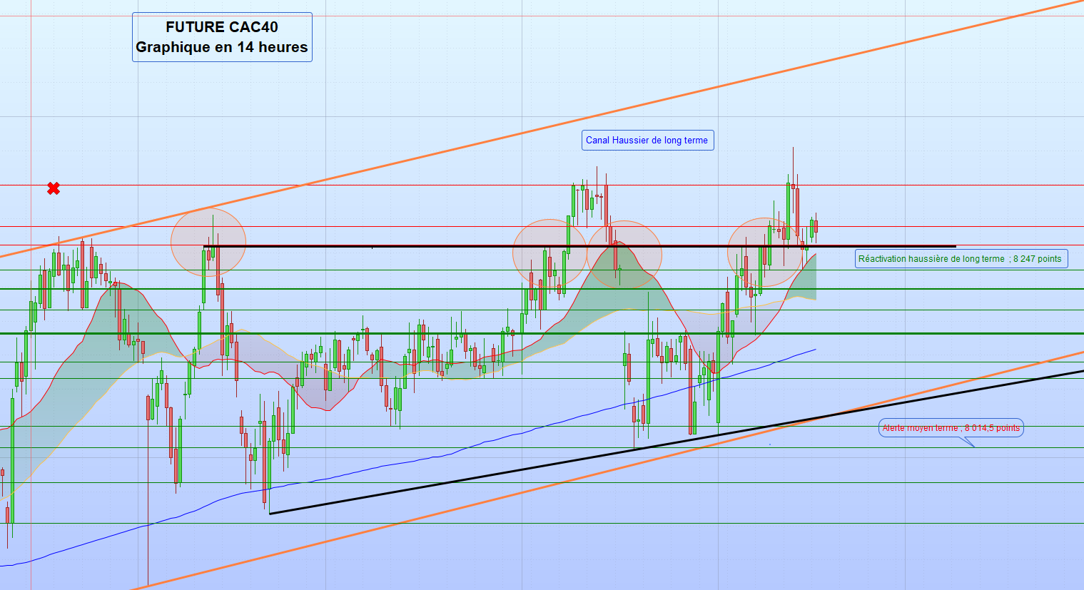 Graphiquement, le future CAC 40 (données à 14h) conserve une orientation haussière de fond tant qu’il évolue au-dessus de 8 247 points. La validation du dépassement des 8 311 points, idéalement confirmée par trois clôtures consécutives au-dessus de ce seuil (deux étant déjà enregistrées) renforcerait le scénario d’une poursuite de la hausse à court terme. Un retour plus marqué des acheteurs et l’appui de nouveaux catalyseurs seront néanmoins nécessaires pour viser les paliers supérieurs. Les prochains repères techniques se situent à 8 338,5 puis 8 399,5 points, des zones à défendre en clôture. À plus longue échéance, la partie haute du canal ascendant, vers 8 600 points, reste une cible théorique tant que la dynamique de tendance demeure préservée.