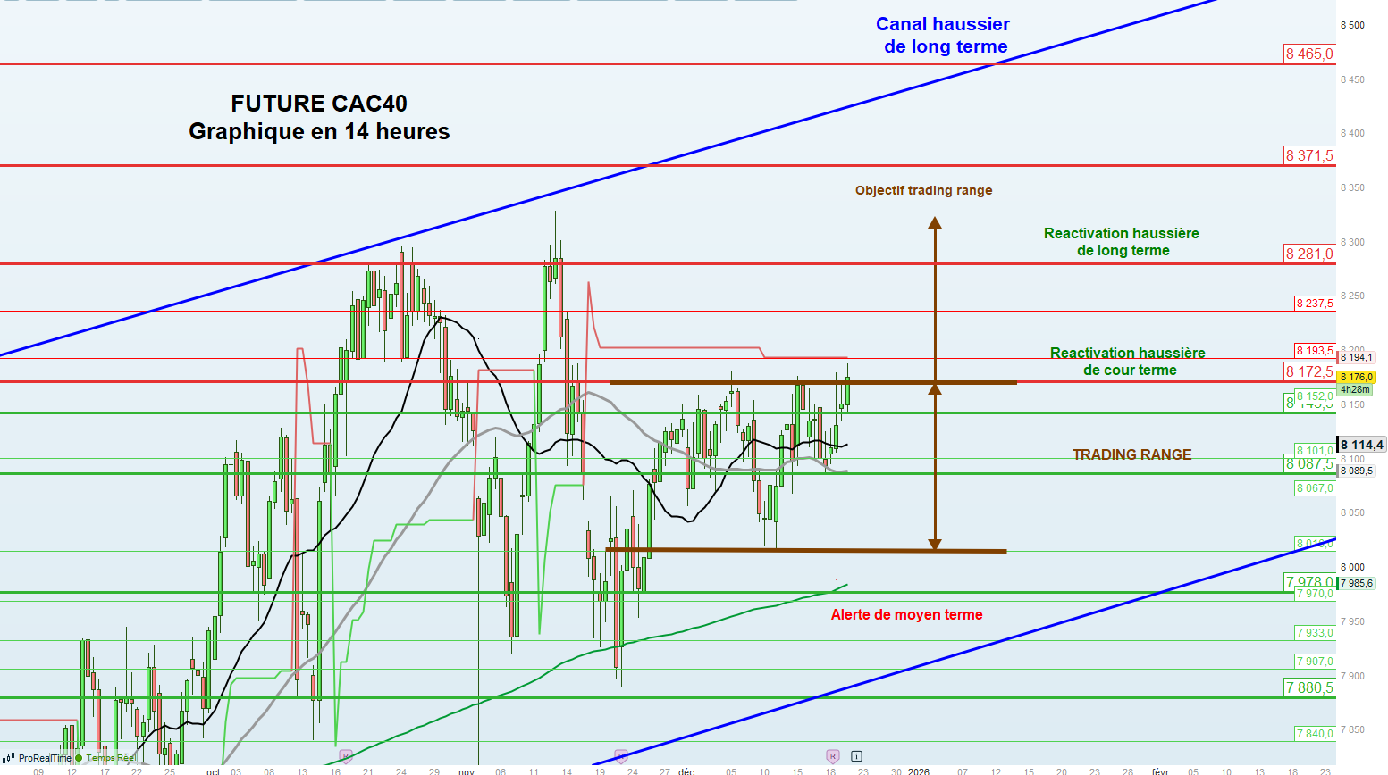 Graphiquement, le Future CAC 40 (cf. graphique en données 14 heures) s’est une nouvelle fois confronté à la borne supérieure du trading range établi entre 8 016 et 8 172,5 points, au sein duquel l’indice évolue depuis la fin du mois de novembre. Un franchissement validé de cette résistance intermédiaire, en clôture et sur plusieurs séances, serait de nature à réactiver l’impulsion haussière de court terme, ouvrant la voie vers l’objectif théorique du canal horizontal situé à 8 324,5 points, à proximité immédiate des plus hauts historiques. Par ailleurs, seul un dépassement net des sommets actuels permettrait de relancer la tendance haussière de long terme, avec pour objectif la zone des 8 450 points, correspondant à la borne supérieure du canal haussier de long terme.