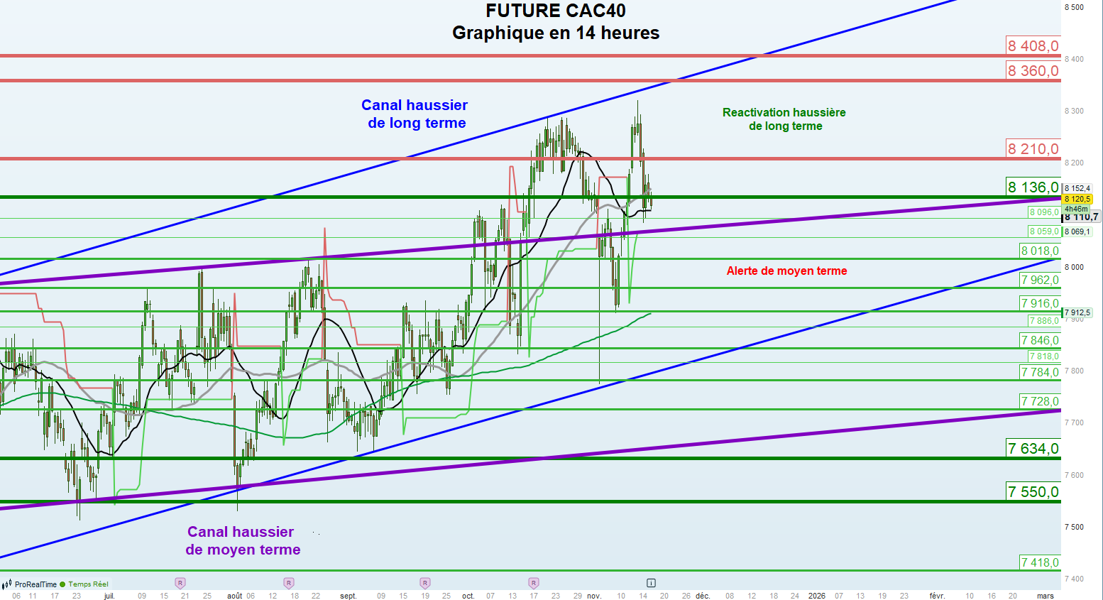 , le Future CAC 40 (cf. graphique en données 14 heures) conserve pour l’heure l’oblique pivot travaillée depuis le début de l’année, après avoir engagé une phase de consolidation à proximité de la partie haute du canal haussier de long terme. Une rupture des 8 072 points, conjuguée à une clôture sous le seuil d’alerte de moyen terme situé à 8 018 points, entraînerait une reprise du mouvement correctif, avec pour première cible la borne basse du canal située aux alentours de 7 800 points, puis pour seconde cible le support majeur positionné à 7 634 points. Pour rappel, la ligne de cou du triple top est située à 7 050 points et sa rupture relancerait la dynamique baissière de long terme, projetant l’objectif théorique vers 5 926 points par réplique de la hauteur de la configuration chartiste.