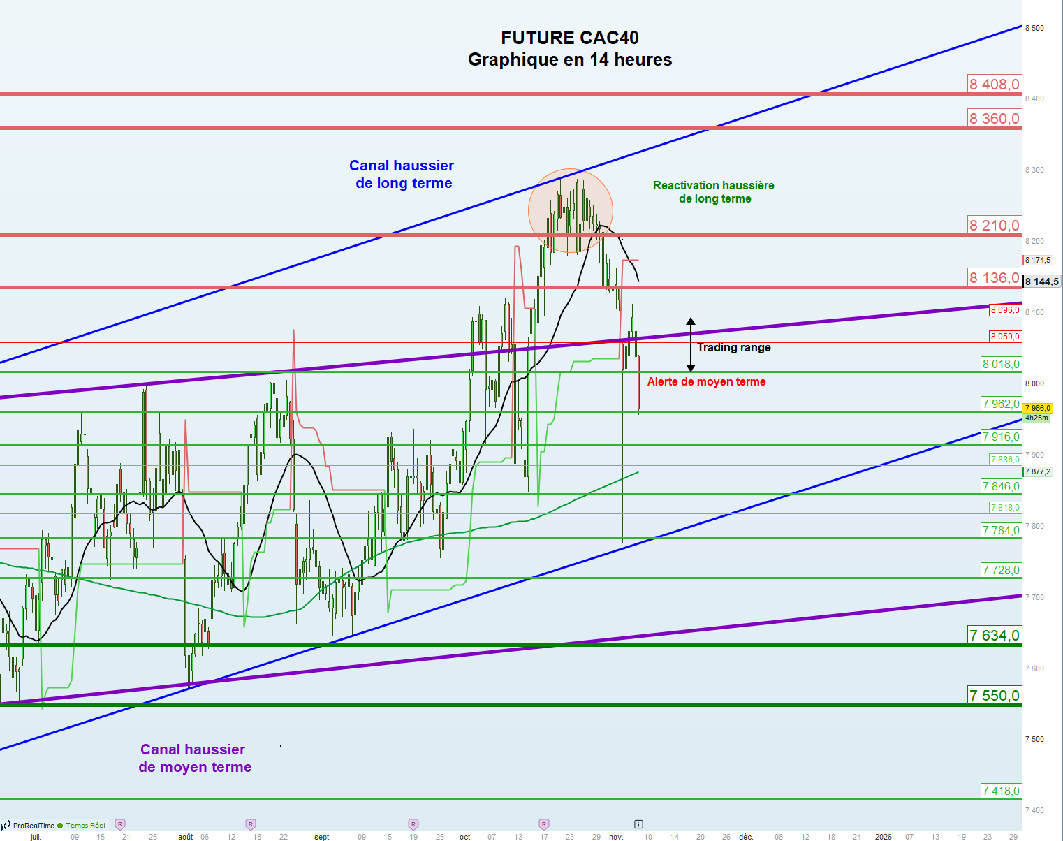 , le Future CAC 40 (cf. graphique en données 14 heures) poursuit sa phase de stabilisation au contact de la partie supérieure de l’ancien canal haussier de moyen terme et évolue désormais dans un trading range compris entre 8 018 et 8 059 points. Une rupture en clôture de ce support intermédiaire marquerait la fin de la consolidation horizontale engagée à la suite du mouvement baissier initié à proximité de la partie haute du canal haussier de long terme. La dynamique haussière de moyen terme, réactivée lors de la séance du 15 octobre, serait alors remise en question, avec en ligne de mire 7 780 points, correspondant à sa borne basse, précédemment atteinte de manière extrêmement abrupte. En deçà, le prochain support se situerait à 7 648 points, correspondant à la borne basse du canal haussier de moyen terme. Rappelons enfin que la ligne de cou du triple top est positionnée à 7 050 points et qu’une rupture de ce niveau relancerait la dynamique baissière de long terme, avec une cible fixée à 5 890 points.
