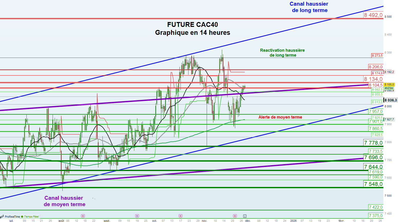 Graphiquement, le Future CAC 40 (cf. graphique en données 14 heures) est parvenu à se réinstaller au-dessus de la borne haute de son canal haussier, après avoir préservé le niveau d’alerte situé à 7 957 points. Un débordement en clôture des 8 104,5 points constituerait un signal précurseur d’achèvement de la phase de consolidation, ouvrant la voie à une séquence plus directive, qui pourrait conduire aux plus hauts historiques en cas de franchissement confirmé de la résistance majeure des 8 134 points. Seul un débordement en force, validé en clôture au-delà de ces niveaux techniques, réactiverait la dynamique haussière de long terme, avec un objectif à 9 364 points, obtenu par réplication.