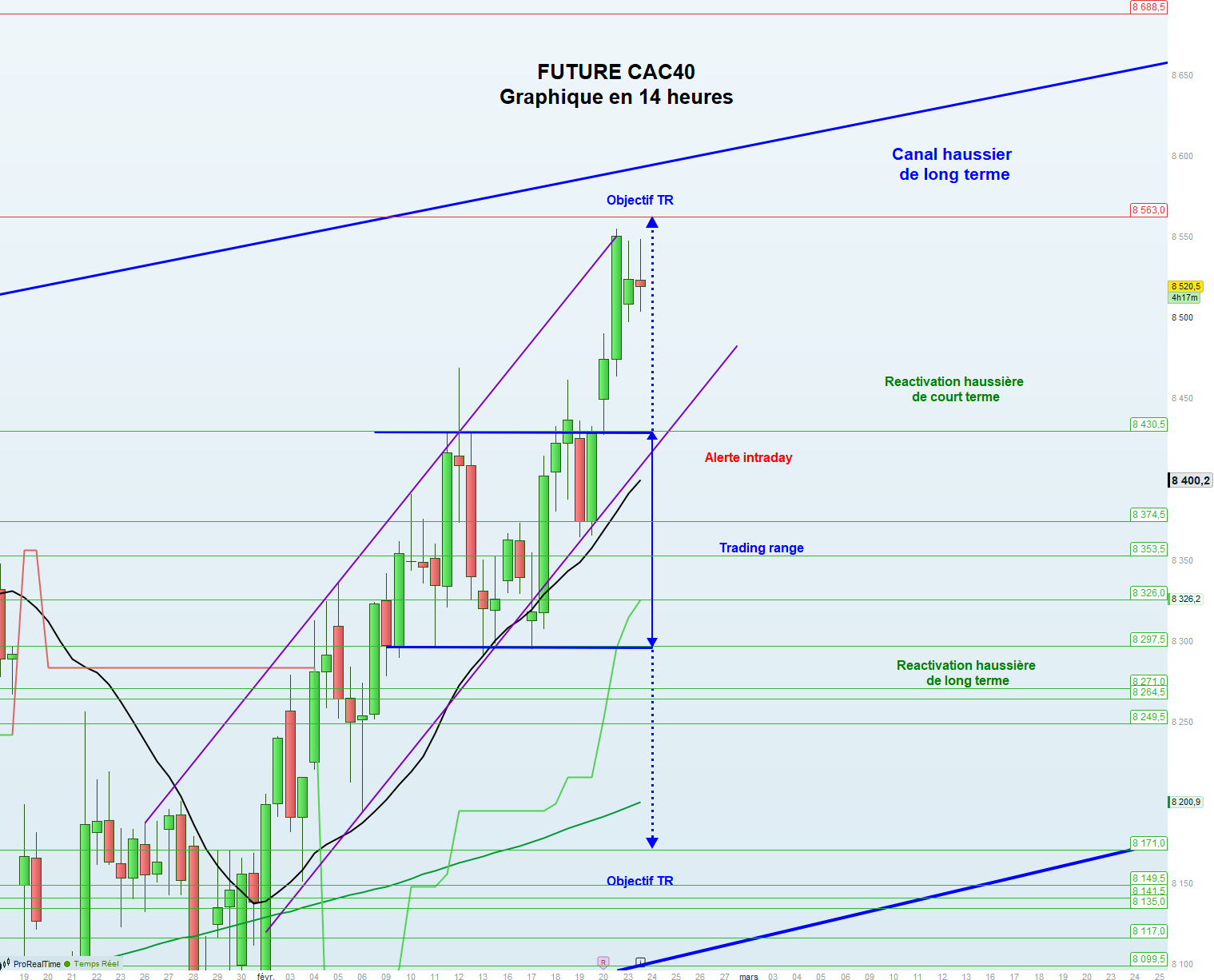 Graphiquement, Graphiquement, le Future CAC 40 (cf. graphique en données 14 heures) a invalidé la structure en vague de Wolfe en s’affranchissant par le haut du trading range, dont les bornes étaient comprises entre 8 297,5 et 8 430,5 points. Cette sortie haussière, matérialisée par une impulsion directionnelle nette, a propulsé l’indice à proximité immédiate de l’objectif théorique situé à 8 563 points, quasiment atteint lors de la séance précédente. Un franchissement de cette résistance ouvrirait la voie à une extension du mouvement vers la partie haute du canal haussier de long terme, localisée à 8 595 points. Une sortie de ce canal par le haut confirmerait la vigueur du marché, bien qu’elle exigerait néanmoins la présence d’un catalyseur significatif pour se concrétiser.