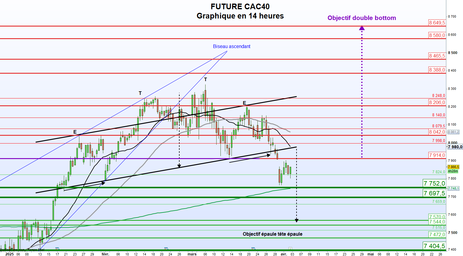 Graphiquement, le Future CAC 40 (cf. graphique joint en 14 heures) a initié, lors de la séance du 31 mars, un rebond aux abords de la zone support comprise entre 7 752 et 7 697,5 points, après avoir rompu, la ligne de cou de la figure de retournement en épaule-tête-épaule et ouvert en gap baissier sous 7 914 points. Un mouvement qui pourrait remettre en cause la validité du double bottom, formé suite à l'annonce de la dissolution de l'Assemblée nationale, dont l’objectif est situé à 8 649,5 points. Cependant, un débordement des 7 914 accompagné d’une extension vers les 7 970 points constituerait un pullback, renforçant ainsi la validité de l'épaule-tête-épaule et augmentant la probabilité d’une reprise baissière en direction de la cible de l’ETE, positionnée à 7 560 points.