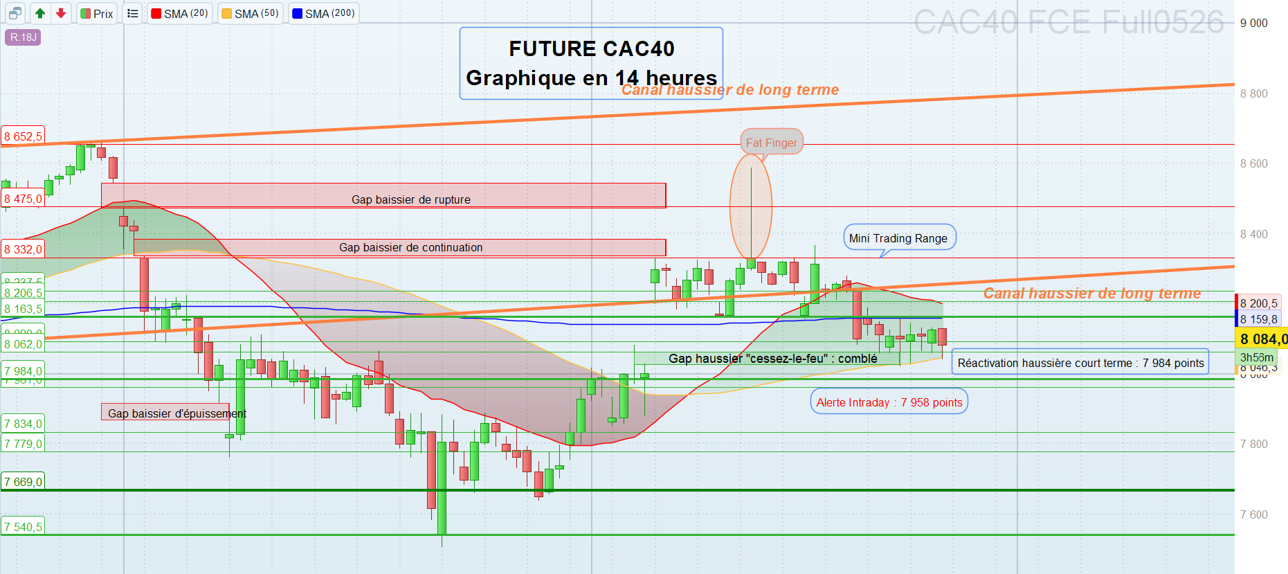 Point de vigilance : la mèche observée sur la bougie du 14/04/2026 résulte d’un « fat finger », c’est-à-dire d’une erreur de saisie d’ordre susceptible d’avoir provoqué un mouvement de marché technique. Cet élément exceptionnel n’a pas été retenu dans l’analyse de ce point journalier.