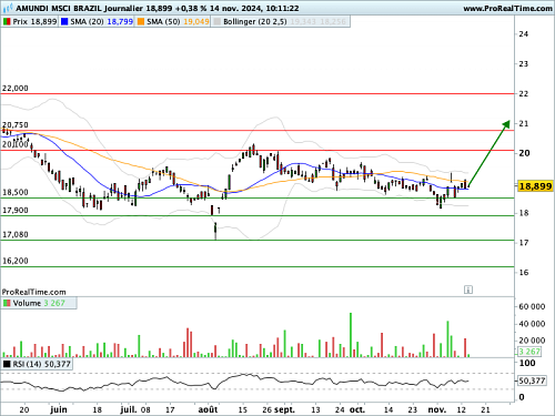 Au regard des éléments graphiques mentionnés, l'équipe de BFM Bourse propose aux investisseurs actifs de prendre position à l'achat sur le tracker LYXOR ETF IBOVESPA, au cours actuel, avec les 22.0000 € dans le viseur. Un stop de protection devra être placé à 17.8900 €.