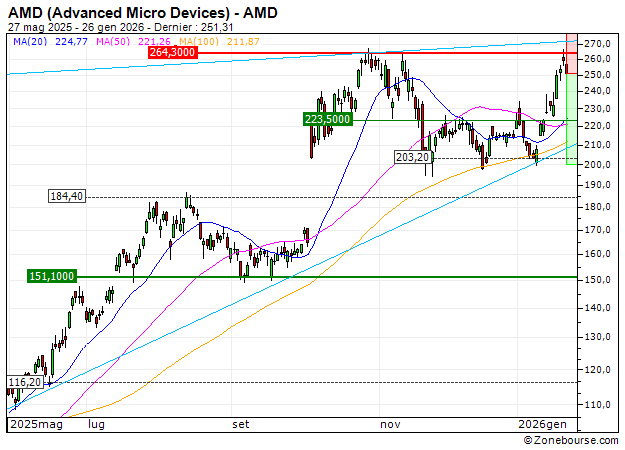 Après le rebond de ces dernières séances, le titre AMD (Advanced Micro Devices) revient au contact de la zone de résistance majeure des 264.3 USD. Cette zone de cours pourrait susciter de nouveaux dégagements et renvoyer le titre sur les 200 USD, première zone de soutien importante.