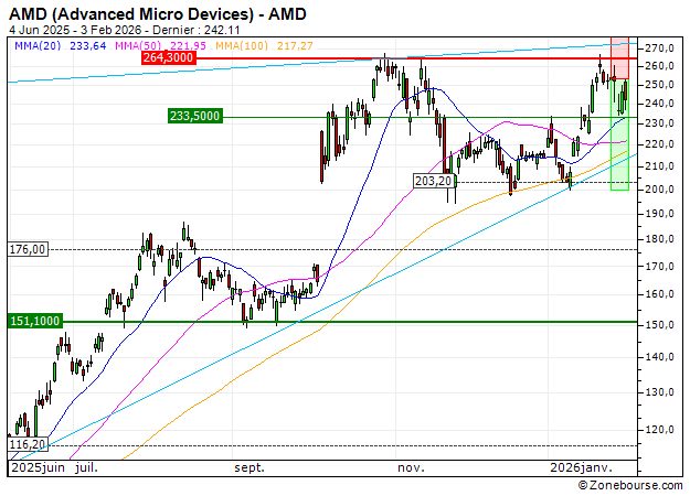 (Zonebourse.com) Après le rebond de ces dernières séances, le titre AMD (Advanced Micro Devices) revient au contact de la zone de résistance majeure des 264.3 USD. Cette…