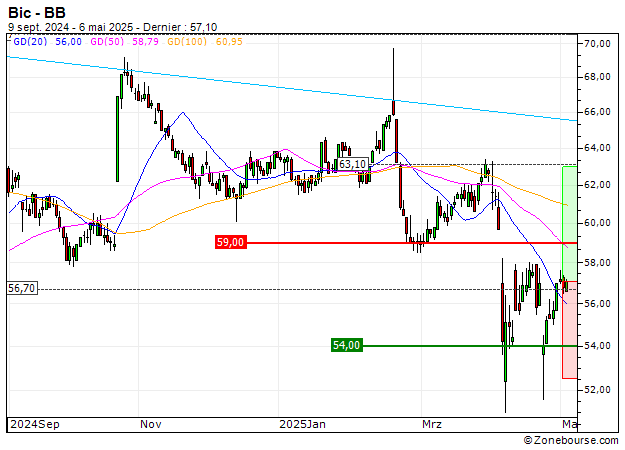 Le récent mouvement baissier a renvoyé le titre Bic au contact de niveaux intéressants situés vers 54 EUR. Cette zone pourrait faire barrage au trend baissier de ces dernières séances et confère un bon timing à l'ouverture de positions acheteuses.