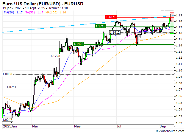 La reprise technique dernièrement observée sur l'EUR/USD devrait trouver un point d'arrêt dans la zone de cours actuelle. Le timing apparaît pertinent pour anticiper le retour d'une dynamique baissière, avec les 1.16 USD comme principal objectif, zone de convergence avec la moyenne mobile à 100 jours.