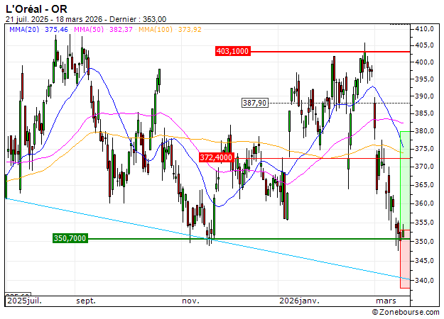 Le titre L'Oréal a fortement corrigé ces dernières séances et revient à proximité d'une zone de soutien majeur qui pourrait susciter quelques achats à bon compte.