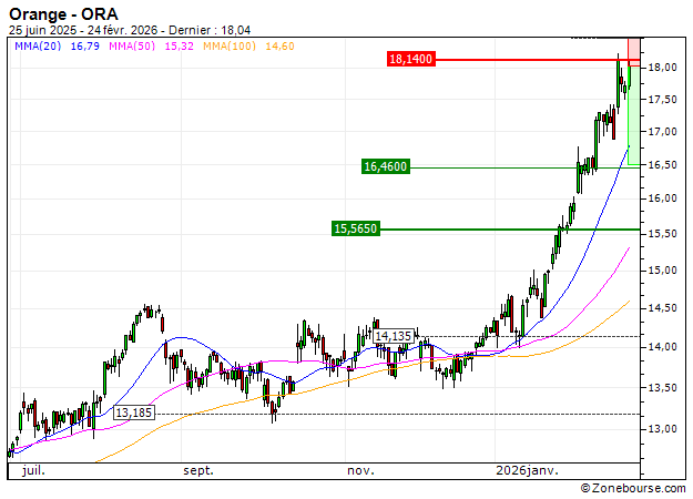 La valeur Orange est, en effet, en zone de surachat et la proximité du niveau actuellement testé confère un timing intéressant pour mettre à profit une correction technique dans les séances à venir en direction des 16.5 EUR.